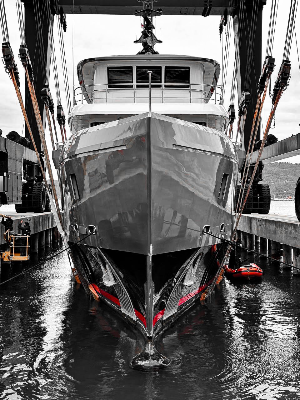In 2024, refit and maintenance works included servicing of stabilisers and bow thruster, together with maintenance of onboard systems such as fire pumps and bilge pumps. The scope also comprised restoration of the mechanical, hydraulic, electrical and automation functions of the stern gangway. Deck works involved teak installation on the foredeck and the creation of a custom-made walkway connecting the foredeck to the bridge deck, serving a newly defined relaxation area.