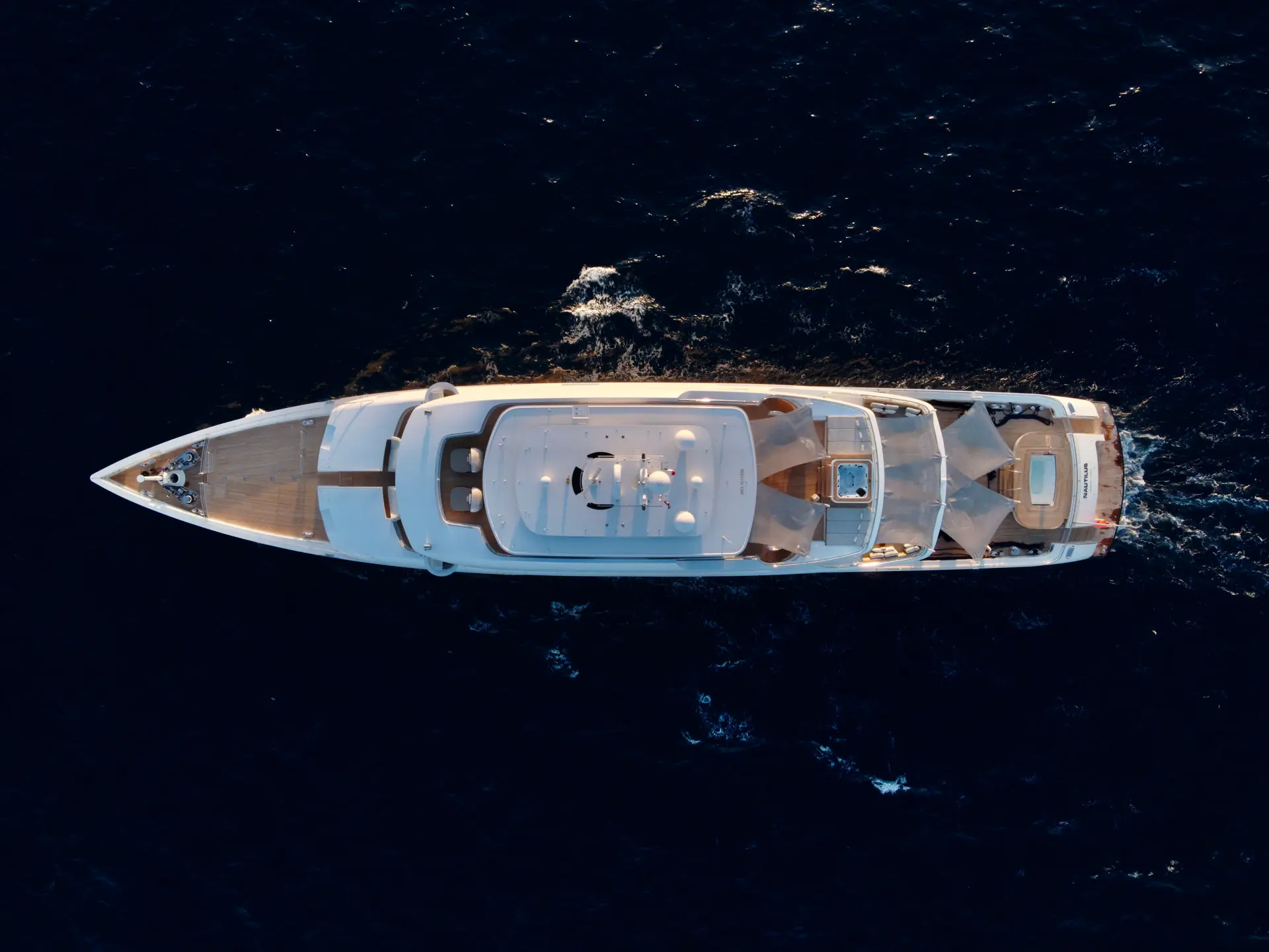 The yacht accommodates up to 16 guests in seven cabins, comprising a full-beam master suite on the main deck, two VIP suites, two double cabins and two twin cabins. Crew accommodation is arranged across ten cabins, providing berths for up to 22 crew members and supporting full operational capability.